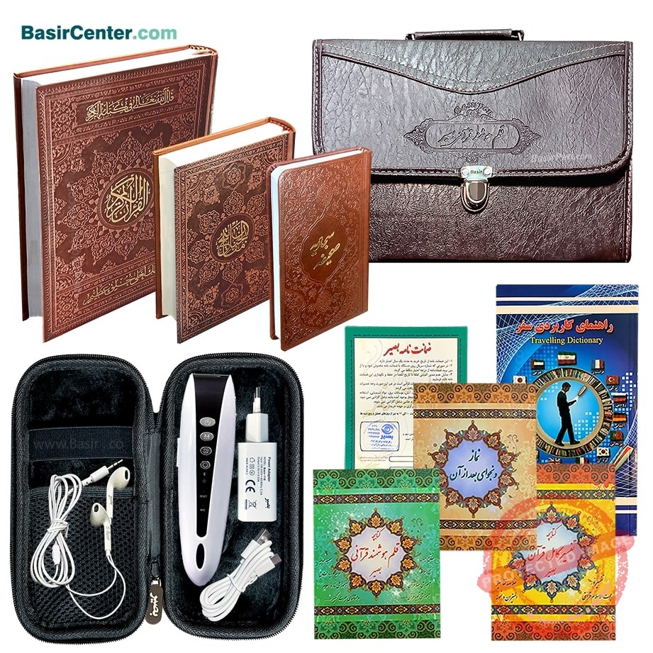 قلم قرآنی جدید بصیر با کیفیت بسیار عالی و امکانات بی نظیر همراه با کتاب قرآن بدون ترجمه (15 سطری) عثمان طه ویژه حافظان (حفظ و تثبیت قرآن کریم) به همراه 3 دفترچه اصلی شامل تمامی امکانات جانبی (صحیفه سجادیه، نهجالبلاغه، منتخب ادعیه و زیارات، داستان، سرود، سخنرانی و … ) به همراه شارژر هدفون و کارت گارانتی داخل کیف برزنتی با قیمت بسیار مناسب و کیفیت بی نظیر و امکانات بسیار کامل.