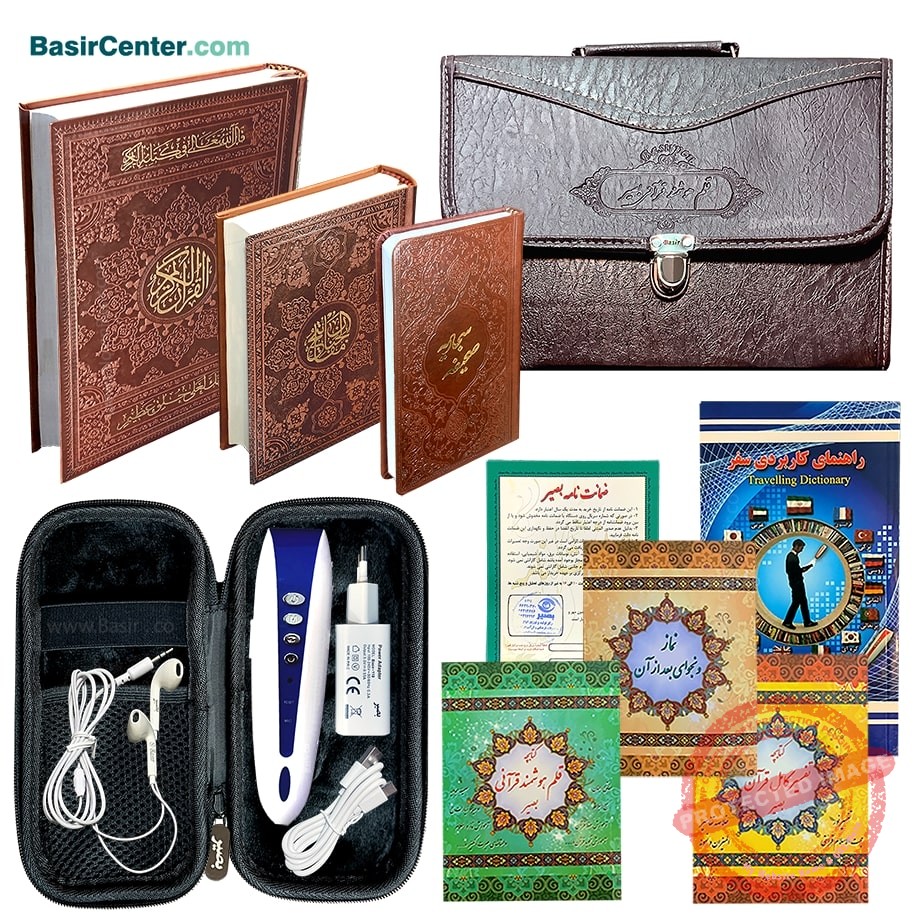کامل ترین و آخرین بسته قلم قرآنی بصیر با امکانات عالی و بی نظیر که به صورت ویژه توسط این مرکز عرضه می گردد .این بسته همراه با قرآن وزیری بسیار درشت خط (1208 صفحه ای و درشت خط ترین کتاب ویژه قلم هوشمند قرآنی) دارای ترجمه فارسی زیر، کتاب منتخب مفاتیح درشت خط، دفترچه های گوناگون و کاملترین امکانات همراه با کیف طرح چرم با قلم هوشمند با کیفیت بسیار عالی و قابلیت به روز رسانی و با قابلیت استفاده از جدیدترین کتاب های تولید شده توسط موسسه بصیر گامی جدید در نسل قلم های هوشمند نهاد. این بسته از هر لحاظ مورد تائید شرکت بصیر است و نسبت به بسته های مشابه دارای کیفیت و امکانات عالی و بی نظیر است که توسط این موسسه با قیمتی مناسب و پشتیبانی عالی توزیع می گردد. همچنین مجوز سازمان دارالقرآن جمهوری اسلامی ایران در انتهای کتاب قرآن این بسته چاپ شده و قلم قرآنی دارای کیفیت عالی با یک سال گارانتی تعویض و سه سال خدمات پس از فروش می باشد.