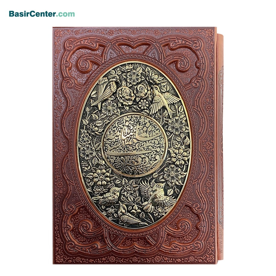 کتاب قرآن نفیس چرمی پلاک رنگی بصیر همراه با قاب کشویی