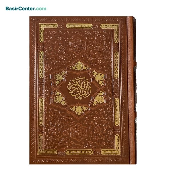 کتاب قرآن نفیس چرمی پلاک رنگی بصیر همراه با قاب کشویی