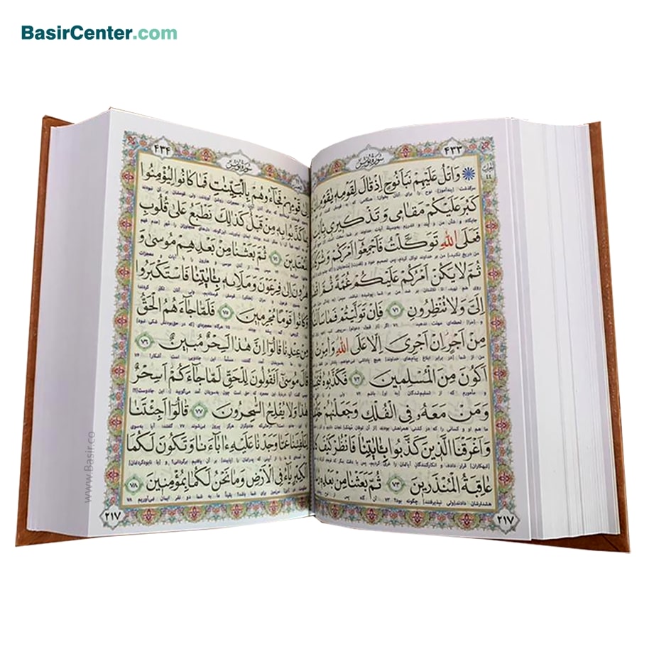 کتاب نفیس قرآن بسیار درشت خط در قطع جیبی با جلد طرح چرم و چاپ بسیار زیبا و کاملا رنگی به خط استاد مصطفی اشرفی و با ترجمه فارسی حسین انصاریان که به صورت تک و یا در تعداد بالا توسط انتشارات نوین بصیر با تخفیف های عالی در سراسر ایران توزیع می گردد.