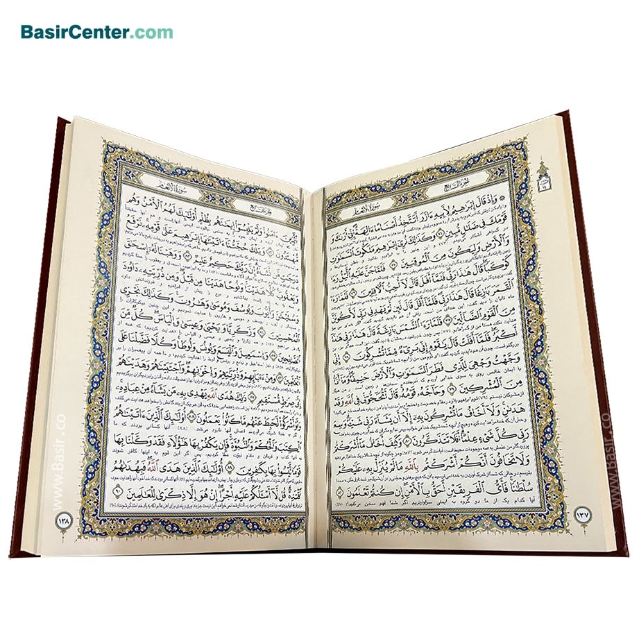کتاب نفیس قرآن کریم در قطع بزرگ رحلی با جلد و قاب بازشو (جعبه) چرمی طرح برجسته و کیفیت عالی با چاپ تمام رنگی و تذهیب بسیار زیبا بر روی کاغذ گلاسه به چاپ رسیده است. این قرآن بسیار زیبا و نفیس به صورت تک و یا در تعداد بالا توسط انتشارات نوین بصیر به سراسر ایران توزیع می گردد.