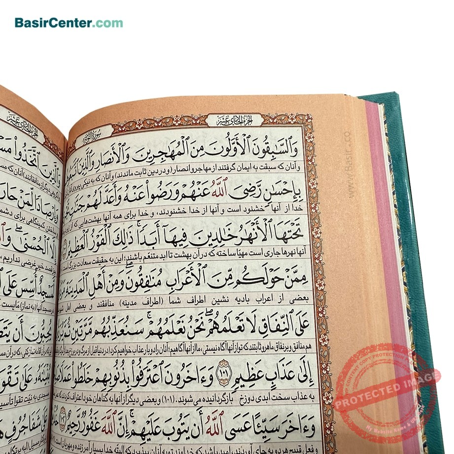 کتاب نفیس قرآن جلد رنگی لبه رنگی در قطع رقعی خط عثمان طه و ترجمه مهدی الهی قمشه ای در رنگ های مختلف
