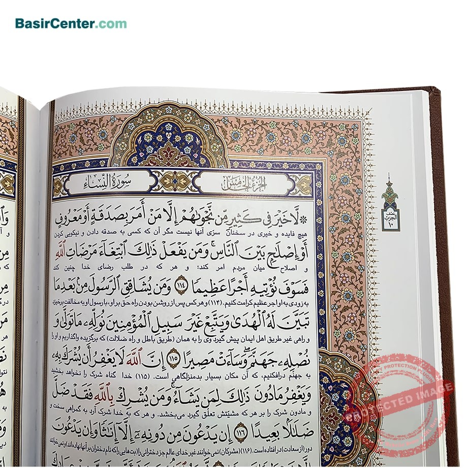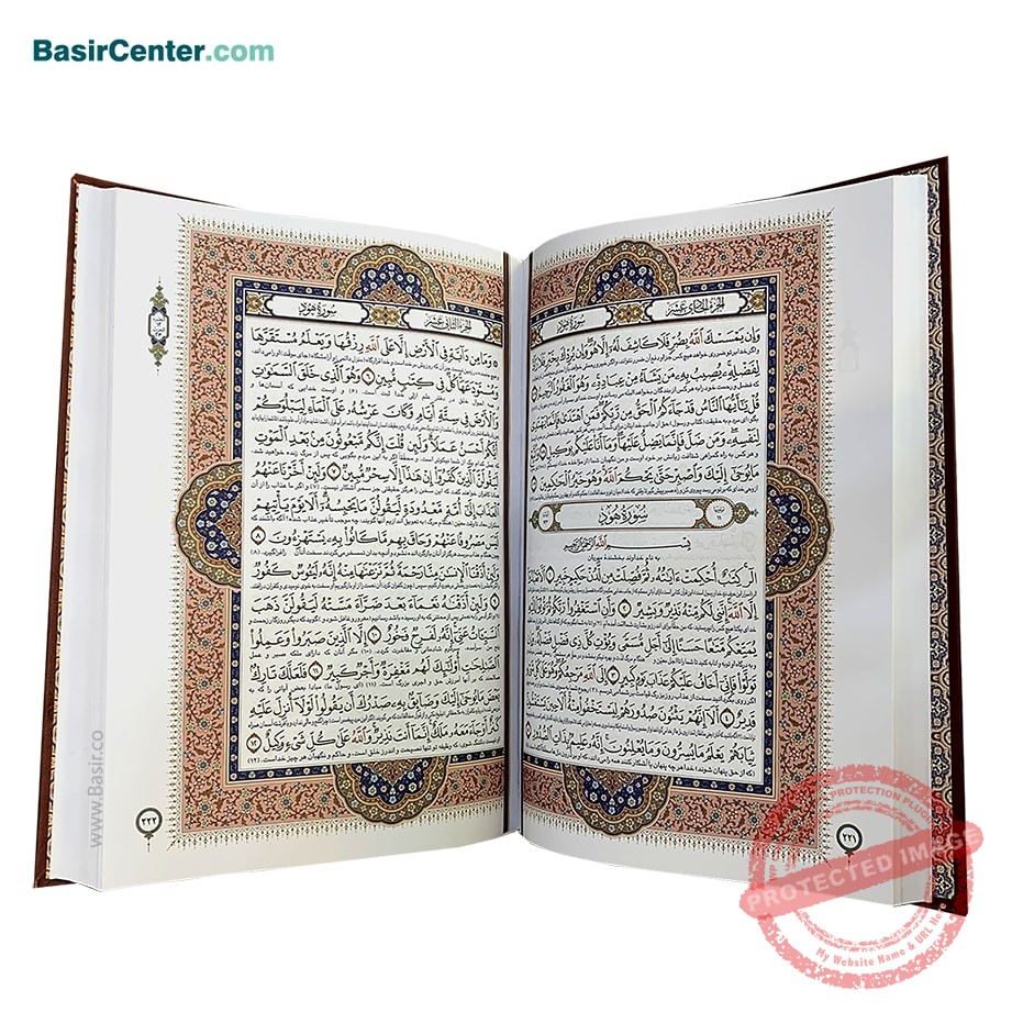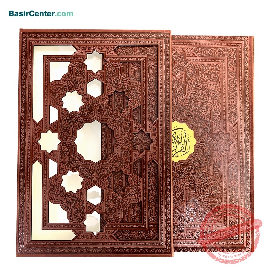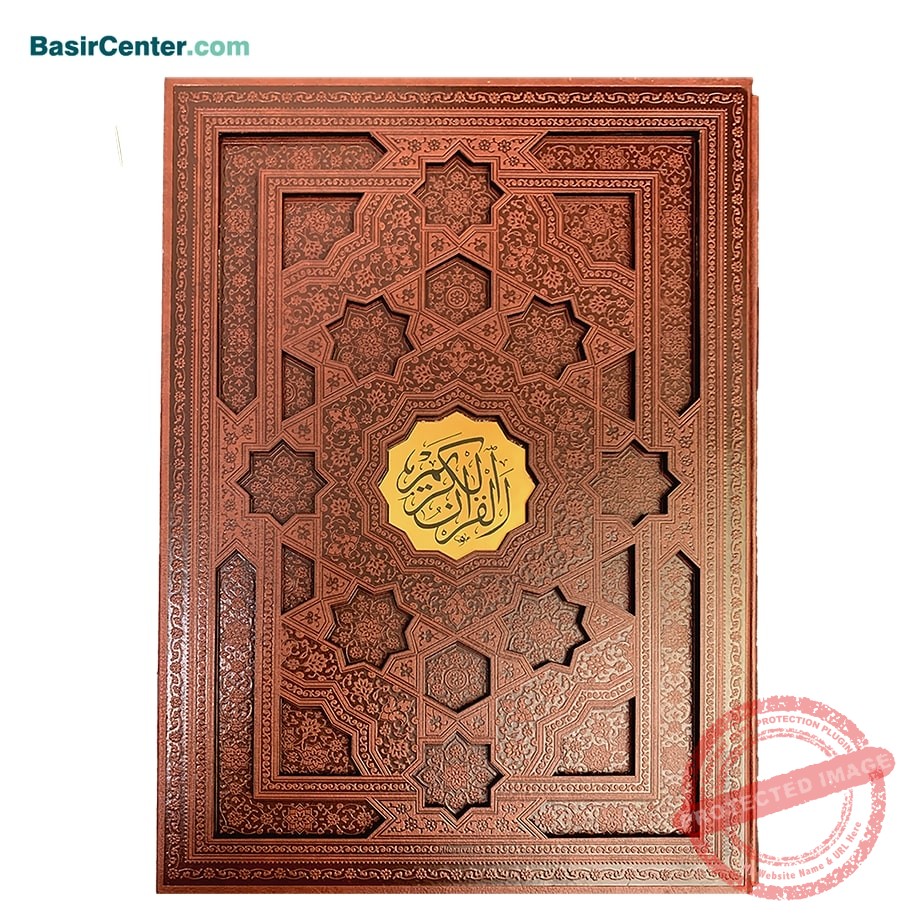 کتاب قرآن نفیس درشت خط و کاملا رنگی با تذهیب زیبا جلد چرمی (ترمو) همراه با قاب کشویی برش لیزری زیبا که به صورت تک یا در تعداد بالا توسط این مرکز به سراسر ایران توزیع می گردد.